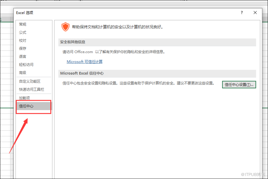 找到选项后,用鼠标点击该功能。再找到【信任中心】,并在信任中心点击信任中心设置。