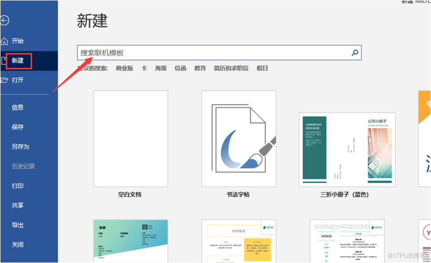 首先,打开一个word文档,点击文件,选择新建。可以在搜索框中选择一个我们想要的模板类型,在搜索出的多个模板中可以选择一个。