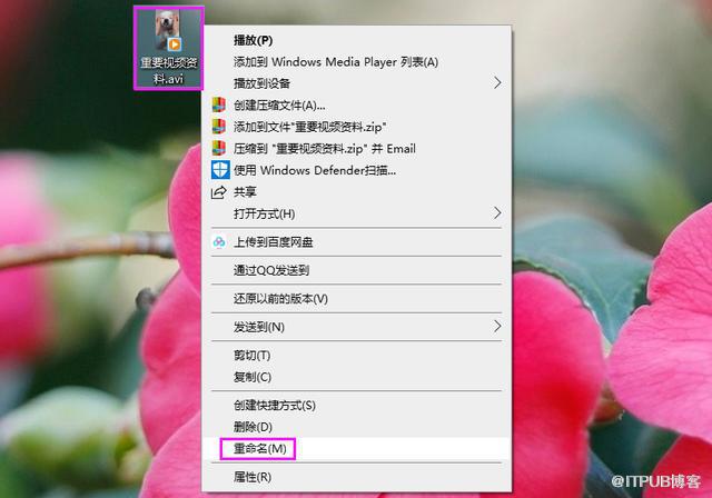 1、可以看到对方发来的视频后缀名是avi,我们先将视频文件拖到电脑桌面上,然后鼠标右击选择【重命名】。