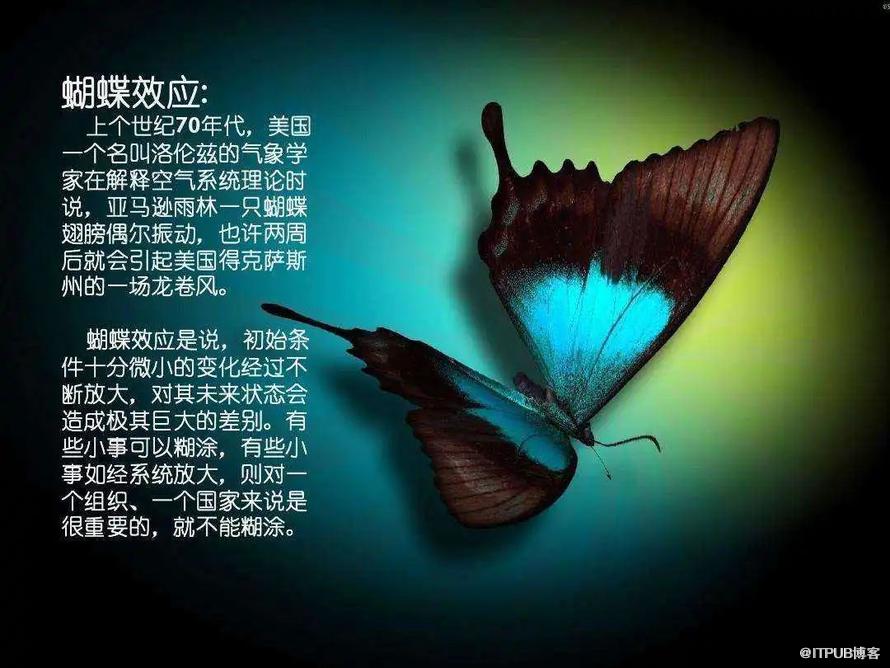 蝴蝶效应说明,初始条件十分微小的变化经过不断放大,其未来状态会产生极其巨大的差别。有些小事可以糊涂,有些小事如经系统放大,则对一个组织、一个国家来说是很重要的,就不能糊涂。事物彼此之间都有联系,注意小事,别让细节成为你的绊脚石;关注细节,让这些偶然的机会成为助你成功的良机。