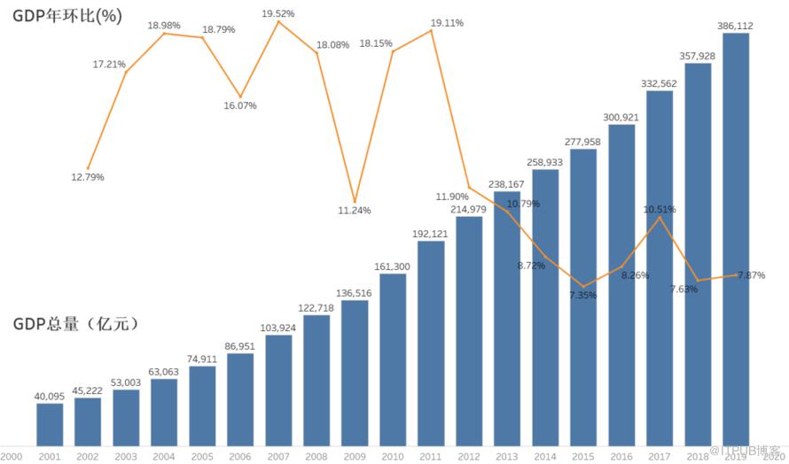 上图是全国GDP总量的变化情况。柱状图表示GDP按年度的总量情况,从2001年的4万多亿,到2019年的38万亿。年均GDP增长,使用了标准的环比方式。从中可见各年的增长情况,从早期的10~20%直接,到2010年后明显有所下降,先基本维持在6~10%左右。下面针对几个典型城市,加以说明。