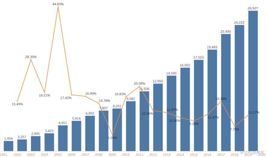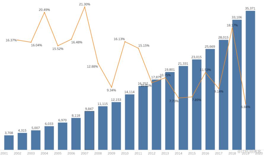 图表,可以使数据更为鲜活,进而更为直观地表达出信息含义。本文针对近20年的主要城市的GDP,做简单的分析。使用了数据可视化中常见的一种方式-图形堆叠。通过图形叠加,很容易表现出数据元素之间的关系,简洁明了。文中的数据取自国家统计局官方披露数据,可视化展现使用Tableau软件。