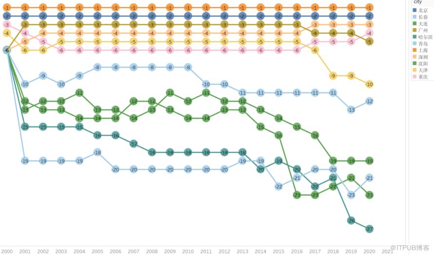 上面示例中,也是使用了叠加图(圆形与折线的叠加)。此外,通过排名指标可以更为直观地看到各城市的发展变化,这要比绝对数字更有冲击力。