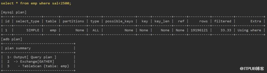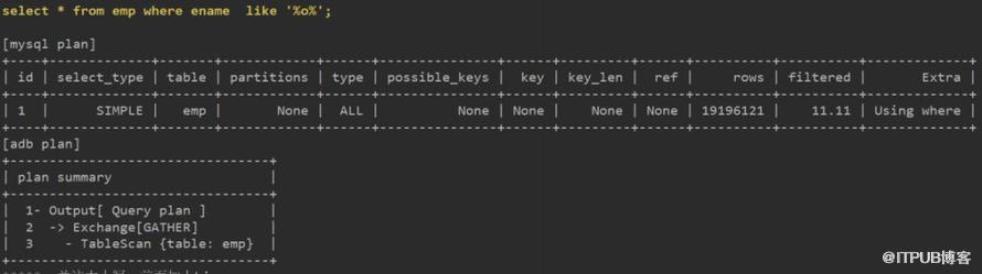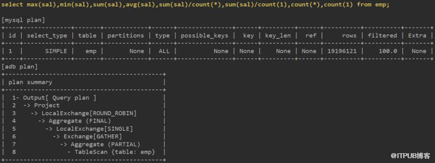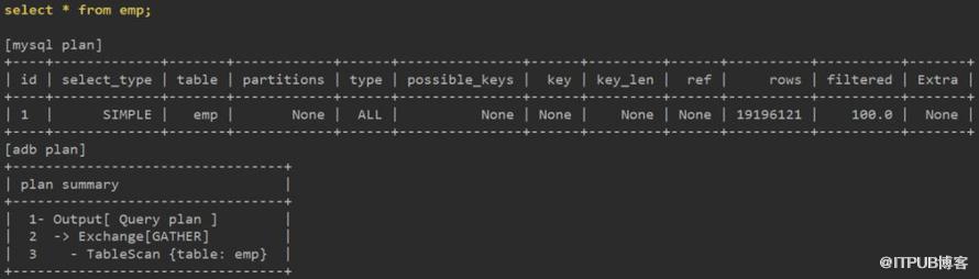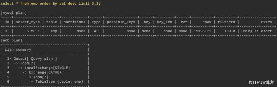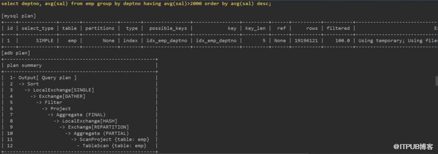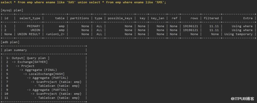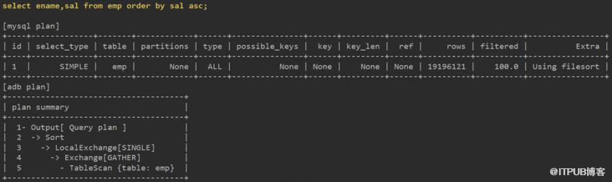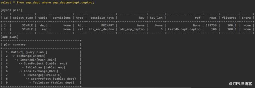 关联部分,ADB使用分布式架构,需要有分片间的数据交换等步骤,并最终使用Hash Join完成。而MySQL依托于索引有序结构,可使用Block Nested Loop快速获得数据。8.0的Hash Join也许对大表间的关联更有优势。