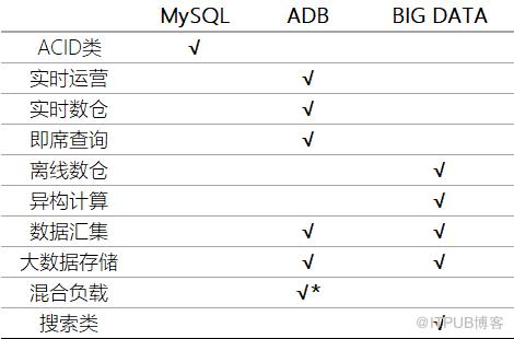 一轮测试下来,对ADB有了更多的了解认识。作为新兴的数据库,对于实时分析类场景,这一产品颇有其特点。此外,其兼容MySQL生态,也很有吸引力,客户的大量软件资产,可以平滑迁移。在架构上,甚至可作为MySQL的从库存在,将复杂类的查询需求迁移上去,减轻主备库压力。可做到一套代码,适用多种场景。这远比之前那种消费到大数据平台,然后异步查询来的优雅。最后,总结下AnalyticDB的适用场景,及与MySQL、大数据平台的对比。(星号部分为计划发展中)