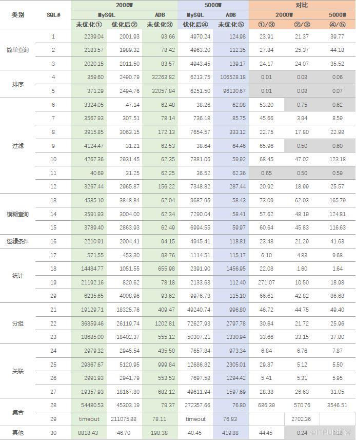 此部分,优化前后差异较大。上图为MySQL未优化的情况,理所当然使用了”Using filesort”,性能很差。在优化后,通过加入索引这一有序结构,可以大幅降低排序成本,性能良好。ADB是分布式架构,需要汇总后排序;而单机版受限架构,无法利用多物理节点的能力,表现一般。