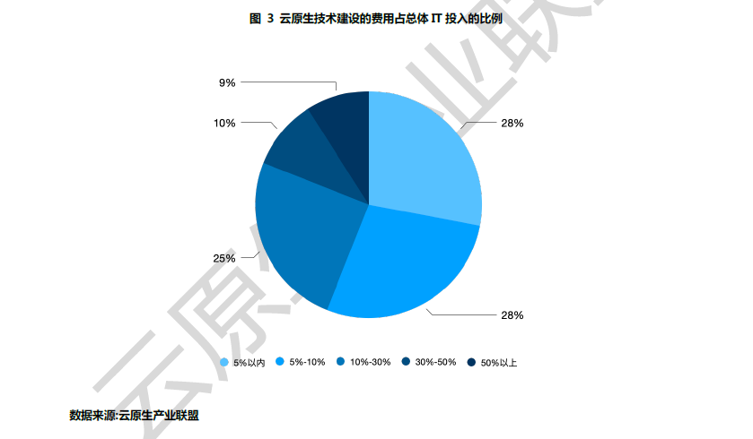 现阶段已有 9% 的用户云原生相关投入已占总 IT 投入的一半以上,技术研发与运维为主要建设支出方向