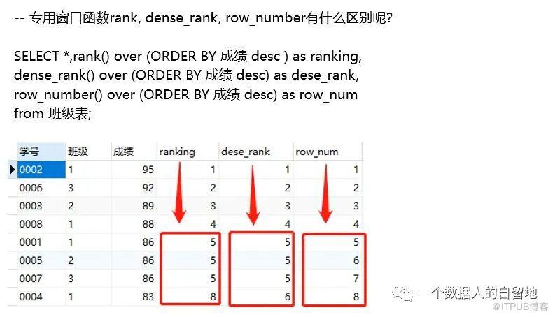 row_number函数:这个例子中是5位,6位,7位,8位,也就是不考虑并列名次的情况,和Excel中的row()函数一样,依据顺序排列下去。