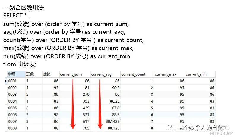 上图以2列突出显示,可以观察到sum()数值不断累加,avg()也是,由此可以说明,窗口函数中可以看到1列的数值动态变化过程。