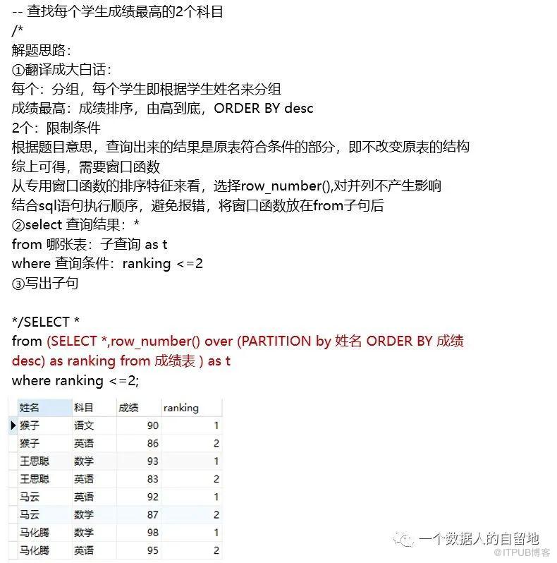 topN问题:在日常工作中十分常用,以查找每个学生成绩最高的2个科目为例: