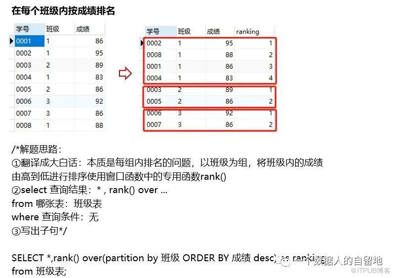 截图示例中使用了专有窗口函数rank,从整体执行效果来看,语句十分简洁。我们也可以理解:为什么要叫“窗口”函数?因为partition by分组后的结果被称为“窗口”,这里的窗口不是指我们家里的门窗,而是表示“范围”的意思。