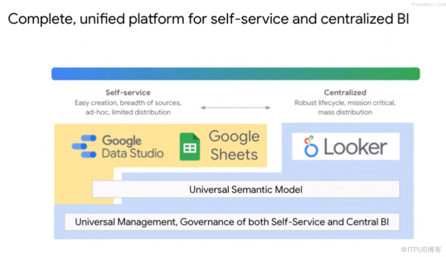 “Looker实际上解决了这个确切的问题,它集中了一个组织中对指标的共同理解,”Hasbe继续说。“我们称其为集中式或管理式BI。因此,今天我们把这两个世界结合起来。现在你可以使用Data Studio或Tableau等工具的自助服务能力,并使用looker语义层的中心模型,你可以在一个单一的地方定义你的指标,所有的自助服务工具将与它们无缝工作。”