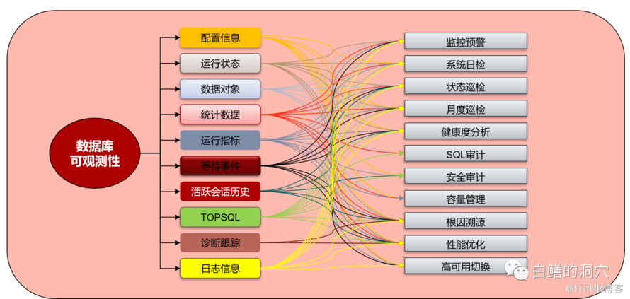 数据库的可观测性能力可以应用于十分广泛的领域,帮助DBA清晰的了解数据库的运行状态,并且能够辅助完成大量的复杂工作。下图是我总结的一张数据库可观测性能力的图。