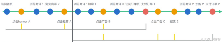 假设这是某用户在某电商app内的行为,我们想要知道促成该用户支付这两笔订单的因素是什么,具体贡献有多少(对应数字是商品id,例如支付订单1,就是支付购买了商品1,浏览商详1就是浏览了商品1的商详页):