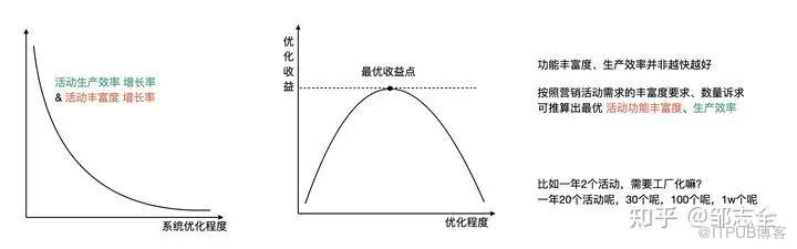 理论上来说,我们的平台是可以无限优化,来压缩活动生产成本的,直至一句口令生成一个活动,啥都不用做,甚至对我们的产品进行分析,来自己决定是否需要一个营销活动,做到“自管理”但是我们需要考虑实际的发展状态,平衡系统优化的收益问题。系统优化往往都会有一个长尾存在,在优化后期能够带来的收益是有限的,投入产出比会越来越小。