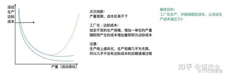 我们要降低的成本,就是指活动生产的边际成本,边际成本应该是在不断降低的,生产第n个活动,应该是生产第一个活动成本的百分之一、千分之一,甚至更低。并且虚拟产品的线上化生产,由于生产规模的限定几乎没有,产量增加,活动生产边际成本几乎不会逐渐上升。