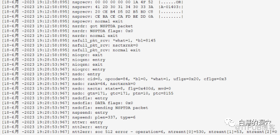 比如说上面的一个分析TNS-12571故障的TRACE文件就是通过在客户端的SQLNET.ORA里设置SUPPORT级别的TRACE参数后生成的。从上面的TRACE中可以清晰的看到19:12:58:895这个时间戳的时候SERVER和CLIENT还在FETCH数据,100毫秒后socket 512就报错了。这个错误是在nsdofls: sending NSPTDA packet时发生的。nsdofls是Oracle数据库中用来发送NSPTDA数据包的一个函数。NSPTDA数据包是一种网络服务数据包,用来传输数据和控制信息。这个动作是在网络通信过程中,将NSPTDA数据包从内存缓冲区写入到传输层的一个步骤。这个时候报错,大概率是和网络本身相关了。