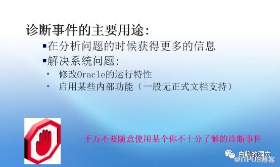 Oracle可以通过诊断事件来对某些行为进行分析,通过设置诊断事件,可以改变Oracle数据库的执行行为,其中就会包括输出更多的诊断信息。你可以通过设置某些诊断事件让某个Oracle报错输出更多可诊断的堆栈信息,从而更加清晰的去定位一个Oracle的潜在BUG。你也可以使用诊断事件输出某些内存结构的详细信息,从而发现数据库存在的物理或者逻辑损坏。除了诊断事件,Oracle还可以对内存结构与物理结构进行DUMP,从而让我们可以分析和诊断复杂的系统故障、死锁等情况。