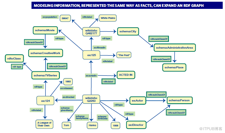 上述图3是图2中RDF图的一部分,其中节点或边周围的绿色边框表示描述数据模型的图元素。在RDF中和在属性图中一样,节点可以属于多个集合。如图中的汤姆·汉克斯既是导演也是演员。但如果一个类是另一个类的子类,则不需要在RDF中指定“父类型”。这些信息是在类级别为属于类的所有资源提供的,因为类信息也是RDF图的一部分。如我们不会在Tom Hanks增加一个类型是人,因为导演和演员本身都是人的“子类型”。在RDF图中,我们还可以捕获关于存储在图中的数据模型的任何信息。而这些信息的存储、访问和处理方式与其他数据完全相同。如图3我们给谓语ex:actedIn增加了一个标签,事实上,我们也可以定义当关系ex:actedIn用于在相反方向(从电影到演员)时,关系的显示名称显示为actors。在RDF图中,在一个语句中用作谓词的资源可以在另一个语句中用作主语或宾语。这也体现出RDF图额外的灵活性,它允许我们存储关于谓词及其用法的信息。这一点也是属性图无法比拟的。