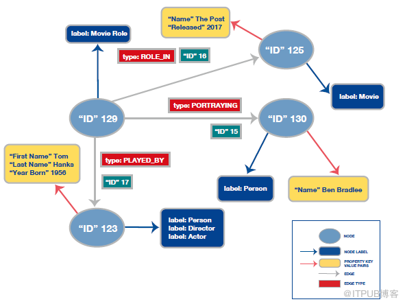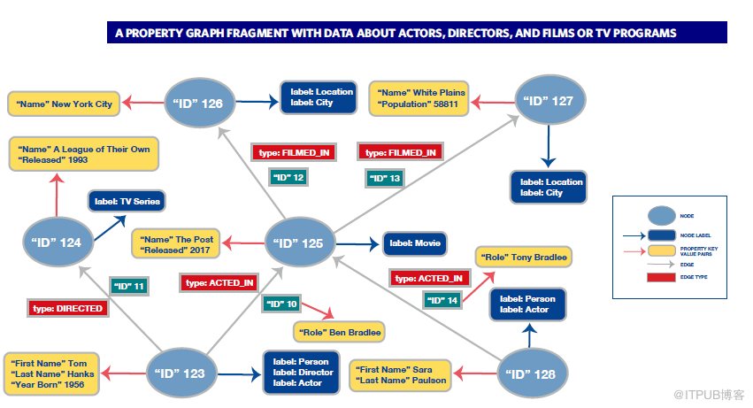 图1显示了一个属性图的部分,其中包含有关演员、导演和他们参与的电影或电视节目的数据。其中节点用椭圆表示。例如,ID为123的节点(从其属性中看出)表示Tom Hanks。节点标签以深蓝色显示。节点123的标签是人物、演员和导演。关系用灰色箭头表示,从一个节点指向另一个节点,每个关系都有一个红色显示的类型。属性显示在带有金色的圆角矩形中,并使用红色箭头连接到它们所属的节点和关系。