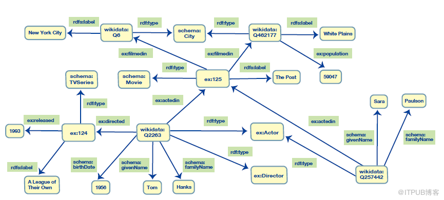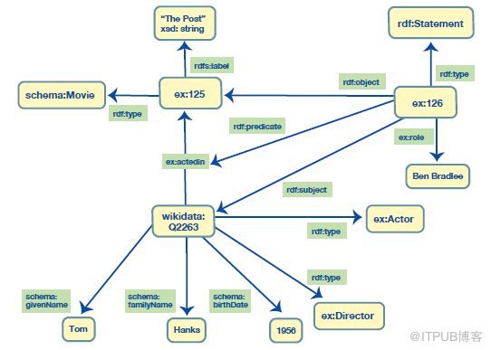 在RDF中,相同类型的边都是相同的,边会被重复使用。这意味着,如果需要增加一些关于Tom Hanks和电影The Post的关系Post(例如,他在电影中扮演的角色),你不能简单地在ex:actedIn里增添一个属性,因为这样的话会在所有的参演这一谓词中增添相同的属性。为了支持在两个特定节点之间的边上附加信息的需要,RDF提供了一种方法来创建一个新的节点来唯一标识源点-边-目标节点三元组。我们就可以使用常规方法对新节点创建语句——它可以是任何语句的主语或宾语。如图5所示,我们在其中创建了一个新节点ex:126来表示语句,Tom Hanks在The Post中的表演,而扮演角色之类关于这个演出的信息都存储在ex:126引出的边中。