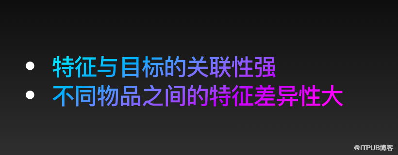 第二点的意思是这个特征要在不同的物品之间有相当明显的差异。比如销量,有的高,有的低;评价,有的是100%好评,有的是80%好评,这些都可以称之为特征。