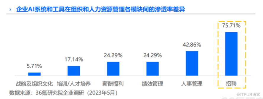 对于已实现AI布局的受访企业而言,不同管理模块间AI技术的渗透率也存在一定差异,招聘(75.71%)模块,远高于人事(42.86%)、绩效(24.29%)、薪酬福利(24.29%)、人才培养(17.14%)和战略文化(5.71%)等其他模块。