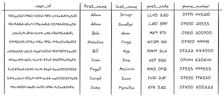 此表将包含有关用户的辅助数据,例如他们的名字、姓氏、出生日期、他们创建帐户的时间戳、他们的电话号码等。