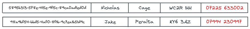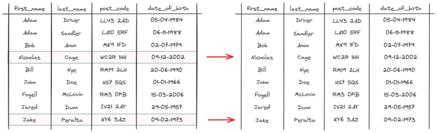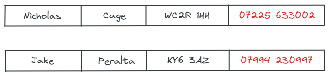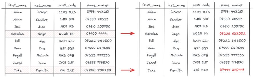 让我们参考前面的例子。您有一个包含一些现有数据的数据库,并且有一组新数据进入。其中一些与您现有的数据相冲突,正如我们在NicholasCage的手机号码中看到的那样: