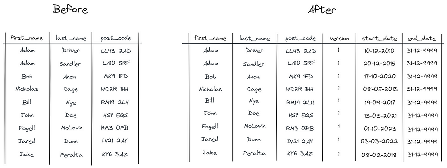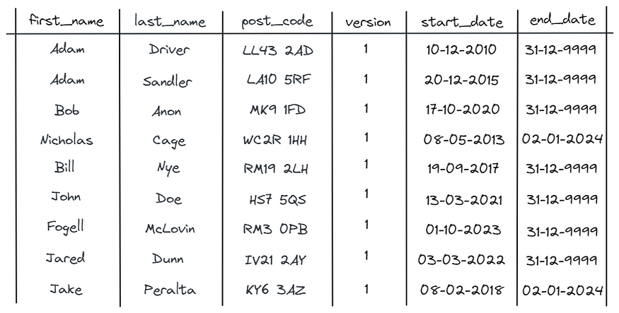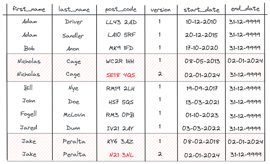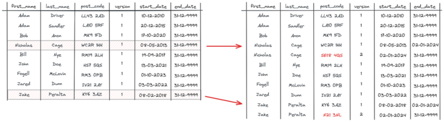 例如,我们可能想要观察用户多年来的位置分布。在2020年将尼古拉斯·凯奇放在他的新地址是没有意义的,因为他当时并不住在那里。因此,我们保留了新旧数据,并保留了版本、start_date和end_date列,以帮助区分两者。