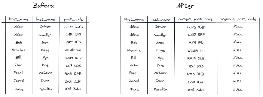 将“current_post_code”中的所有值复制到“previous_post_code”