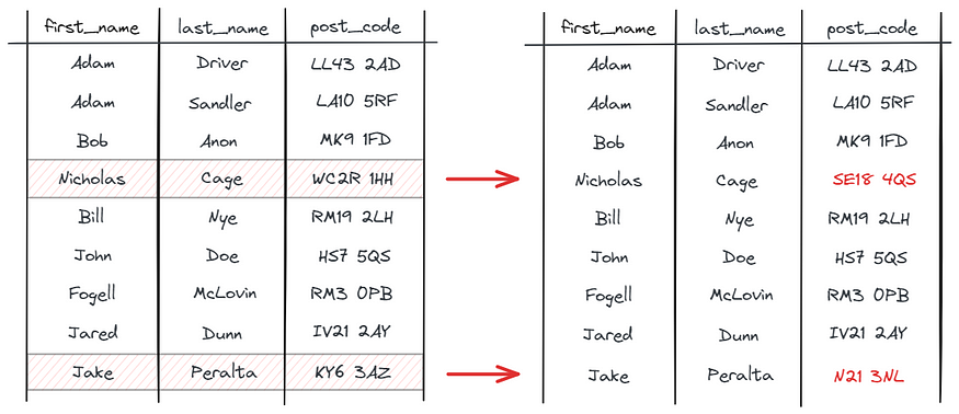 然后替换“current_post_code”中具有新值的所有值: