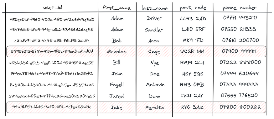 我们注意到,一些新数据与现有数据具有相同的主键(user_id)。尼古拉斯·凯奇(NicholasCage)和杰克·佩拉尔塔(JakePeralta)都有新的手机号码。