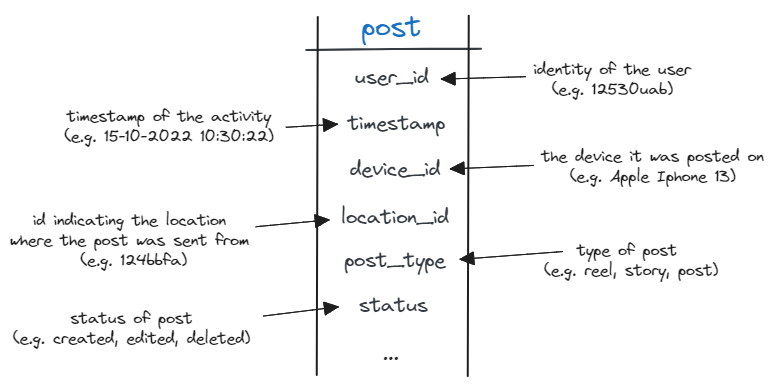 例如,在社交媒体网站/应用程序中,一个名为“post”的事实表可用于捕获与任何帖子活动相关的数据及其所有关键维度。