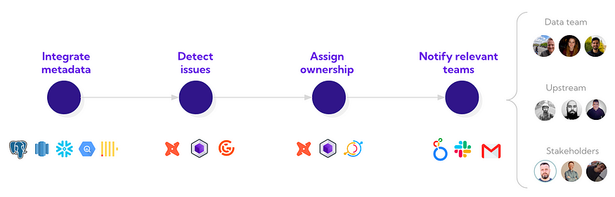但实现这一目标说起来容易做起来难。将其分解为几个步骤可以更清楚地表明差距:(1) 整合元数据,(2) 通过相关测试检测问题,(3) 分配所有权,(4) 以他们可以的方式通知相关人员问题采取行动。
