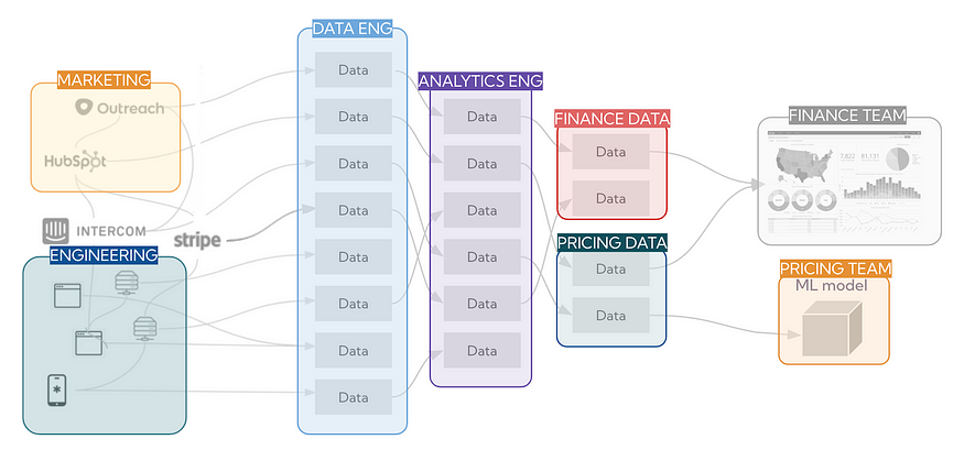 我们建议全面考虑数据所有权——从上游团队拥有的数据源到最终用户拥有的仪表板。为简单起见,我们将建议分为以下几组:(1) 数据团队、(2) 上游团队 (3) 业务利益相关者。