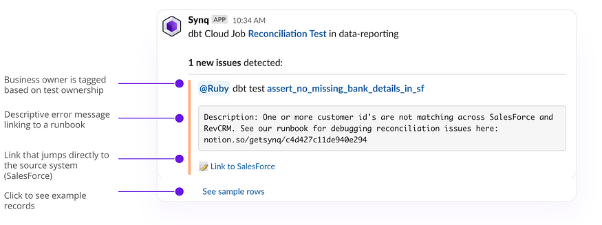 如果做得好,这将创造奇迹。根据测试的所有权自动标记企业主,并将警报发送到他们监控的渠道。错误消息是描述性的,并链接到操作手册、到源系统的直接链接以及一些示例记录 - 换句话说,非技术团队在没有数据团队输入的情况下采取行动所需的一切。