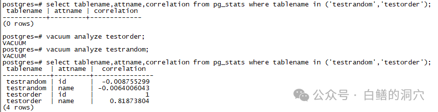 我们来看看这两张表的ID字段的correlation,查看pg_stats之前一定要做一次analyze,否则是看不到数据的。