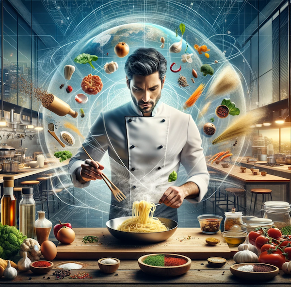 这张图则展现了一位多元化的世界级大厨,他穿着现代化的厨师服装,站在一个充满各种食材和烹饪工具的宽敞厨房中。他正同时使用多种烹饪技术,周围摆满了各种食材和调味料,展现了能够跨越文化界限,融合不同烹饪技巧和风味创造出全新菜品的能力。这代表了大模型技术的特点,即广泛的知识基础和创新能力。