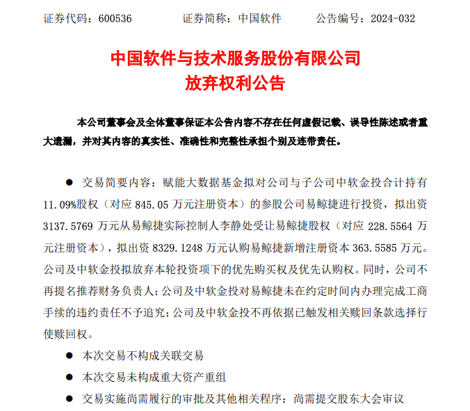 中国软件的公告指出,易鲸捷将引入外部投资者,可为易鲸捷注入新的发展资金和战略合作资源,以助力易鲸捷更好发展。公司放弃本轮投资的优先购买权及优先认购权的目的是为了顺利推进本轮融资以实现易鲸捷更好发展,从而实现公司对易鲸捷的产业投资价值,维护公司股东利益。