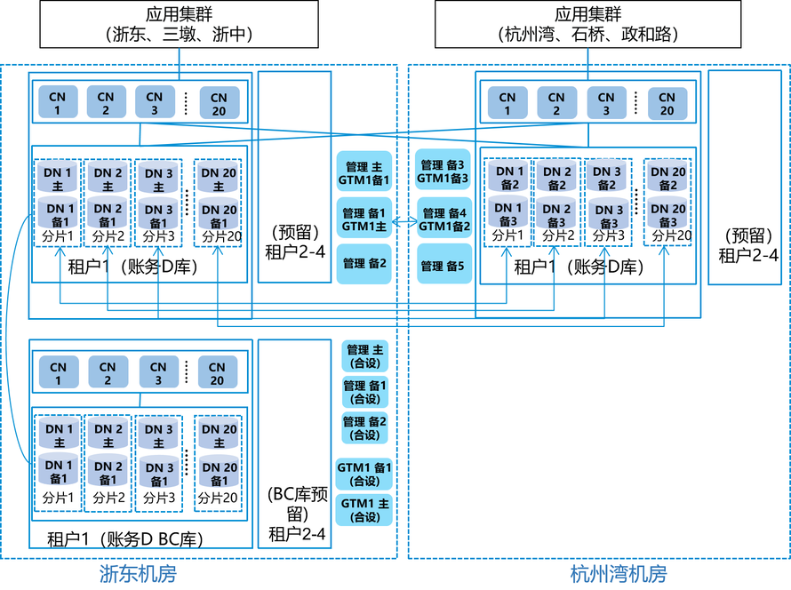 全局事务管理节点(GTM)单边机房各自2套,与管理节点合设。