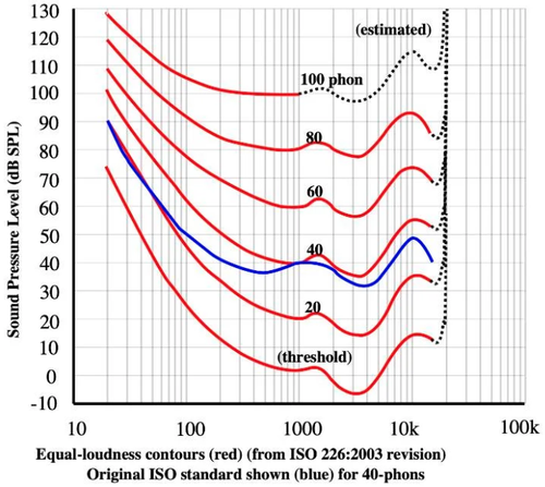 衡量声音的大小往往会用到“音量 Volume”和“响度 Loudness”,分贝(dB/dBSPL)不能像赫兹、克、米那样给出一个客观的量,而只能给出两个相同物理量的比值,所以是一种相对的概念。人耳对不同频率的“响度”感受存在差异,如下图的“等响曲线”图。其中 phon 是响度级的单位,规定在 1000Hz 时,1dBSPL=1phon。在 40phon 以上的区域,当声压提高十倍时,人类的听觉感知只会提高两倍。为了让响度和听觉感知尽量呈线性关系,需要引入另一个响度单位 sone,40phon 等同于 1sone。