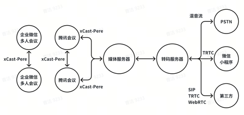 在附文“腾讯会议如何构建实时视频传输算法架构”腾讯强调自 QQ 时代起,在音视频实时传输系统的搭建与优化方面已有多年积累,并重新编写了一个跨平台而且高效的引擎-xCast,引擎之间以 Pere 作为网络层传输协议。结合附文“TRTC 实践,音视频互动 Demo、即时通信 IM 服务搭建”。xCast-Pere 的架构目前仅在腾讯会议生态间支持传输与解析,当数据到达媒体服务器后会在转码服务器里转换为 SIP、TencentRTC 或 WebRTC 进行传输。