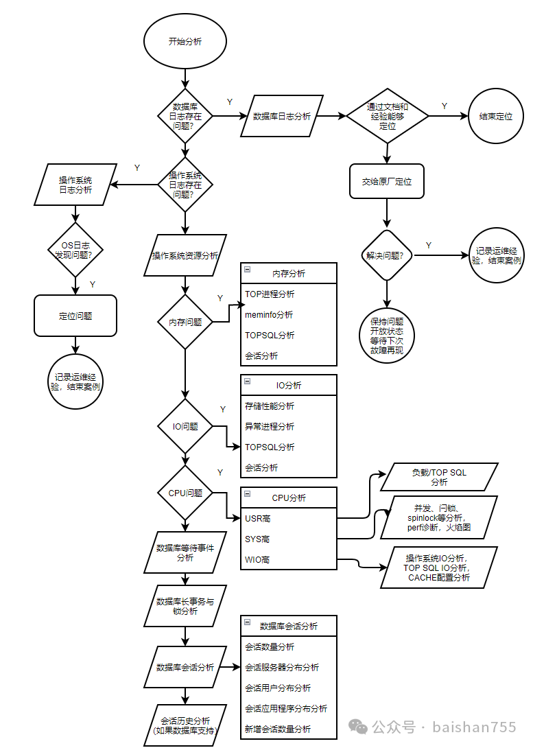 对于大多数国产数据库而言,除了数据库本身存在的问题或者BUG等,大多数的问题还是可以通过一些通用的手段来进行分析的。这两天老白花了点时间梳理了一张思维导图。下面我来简单介绍一下这张导图。