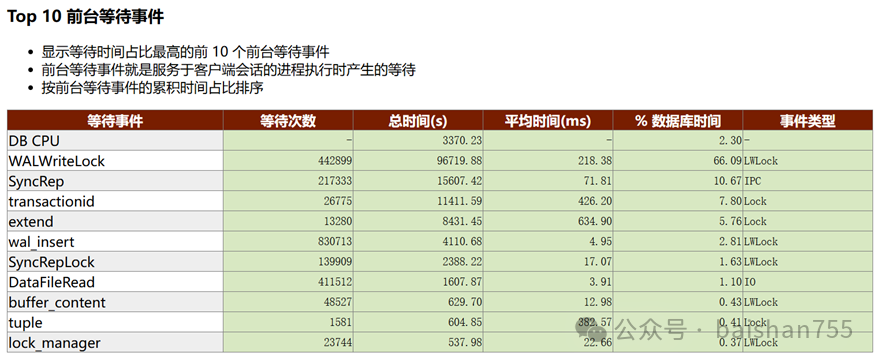 等待事件是分析Oracle问题的最有价值的数据,如果发现明显某种等待事件影响了性能,那么在MOS上丰富的资料库中搜索一番,可能就能找到答案了。不幸的是,国产数据库缺少MOS这样的知识库,因此分析等待事件的能力偏弱一些,不过有经验的DBA还是可以从中分析出一些问题。比如上面的等待事件中,WAL写入锁占了大部分等待时间,优化WAL子系统性能应该能够改善性能。