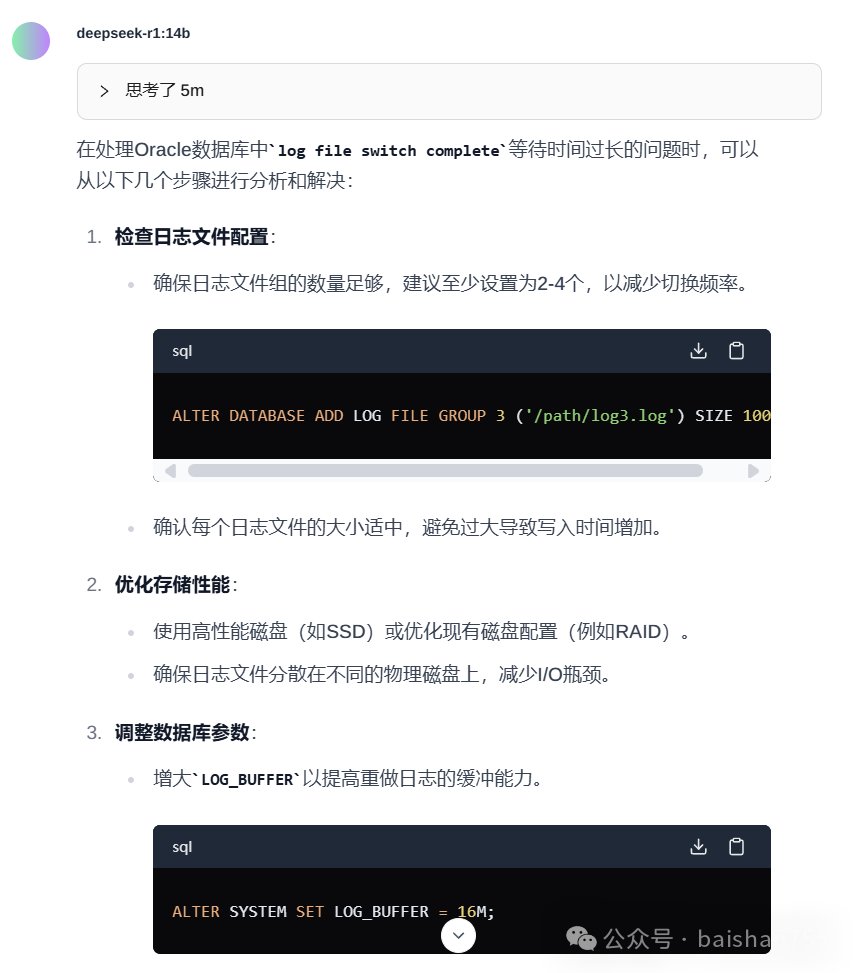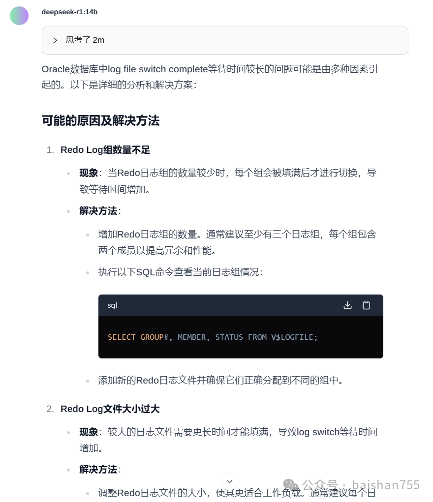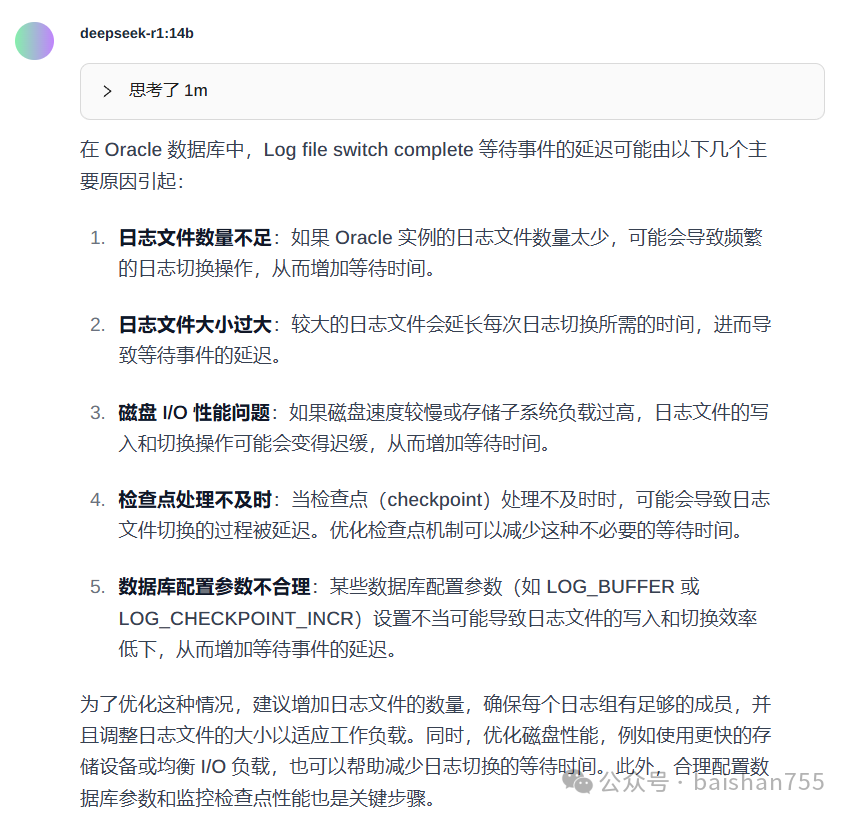 通过这个简单的实验,让我思考了许久。首先基于deepseek-r1去实现更加强大的分析推理,是完全可行的。其次是AIGC并不是万能的,并不是部署了一套deepseek,就可以解决AIOPS的主要问题了,高质量的运维经验依然是实习那AIOPS的关键,在这方面还是需要投入巨大的资源才行。高质量的数据库领域大模型依然是AIOPS 实现中成本最高的,不知道哪个大厂能够率先做出一个并开放给公众免费使用