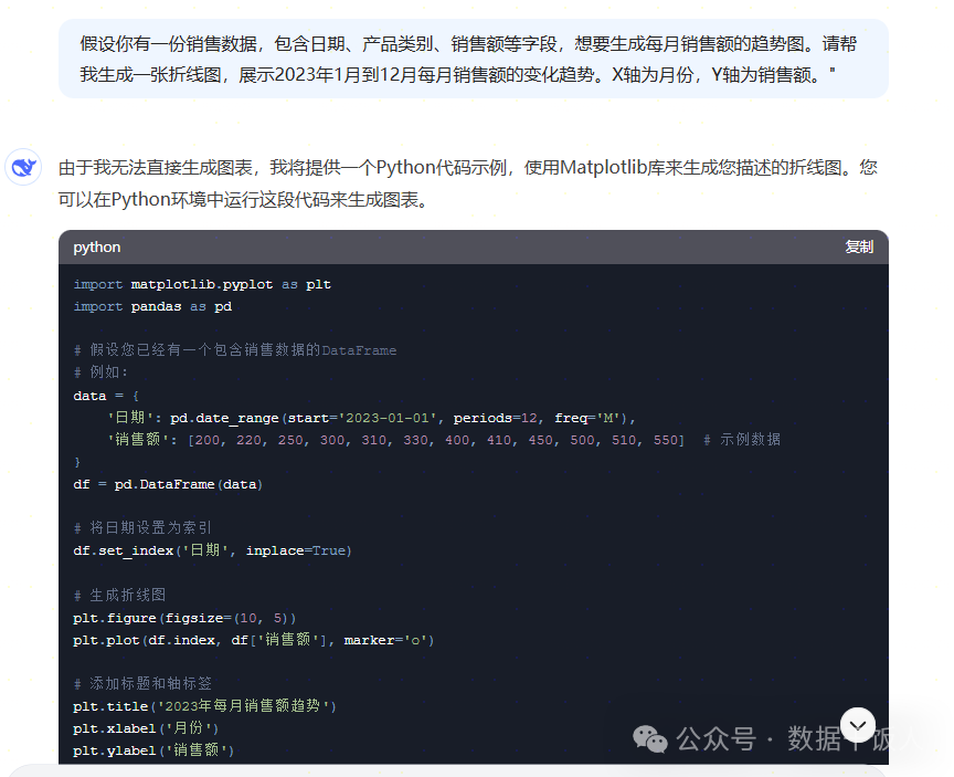 假设你有一份销售数据,包含日期、产品类别、销售额等字段,想要生成每月销售额的趋势图。你可以使用以下prompt:
