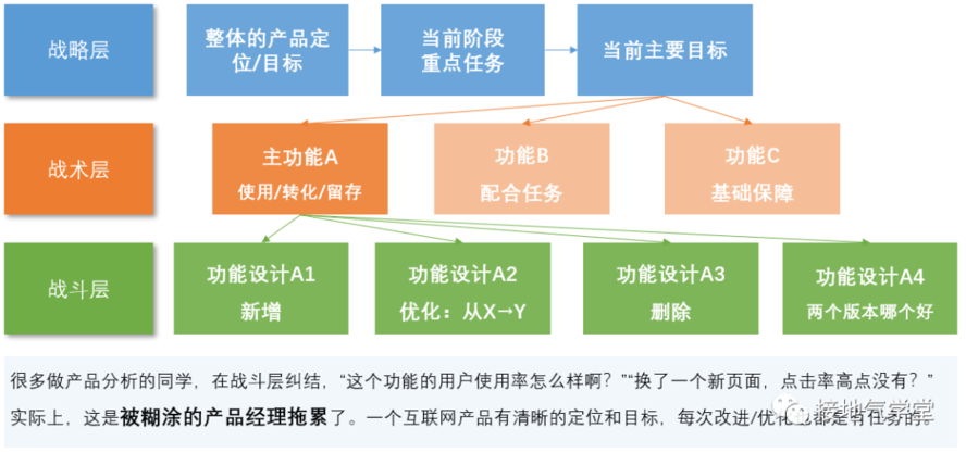 由于没有实体产品,导致了整个供应链的分析完全不存在,实体店、售后自然也不存在了。同时,由于要交付虚拟商品给用户,所以技术开发的工作量特别大,相应的,分析的重点,也转移到我设计的APP用户体验如何?使用情况如何上。产品分析是一个重要议题(如下图所示)