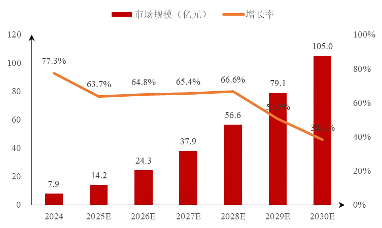 高温超导材料的主要产品形式为带材,常见4mm、6mm、12mm宽度规格。根据赛迪数据,2024年全球高温超导带材市场规模为7.9亿元,同比增长77.3%,预计2030年将达到105.0亿元,2024至2030年间的复合增长率为53.9%。
