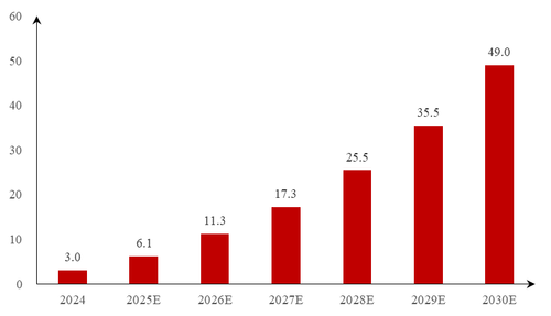 根据赛迪数据,2024年全球磁约束可控核聚变工程使用的高温超导材料市场规模为3.0亿元。随着商业化推进,预计对高温超导材料的使用规模将持续增加,2030年将达到49.0亿元,2024至2030年间的复合增长率为59.3%。